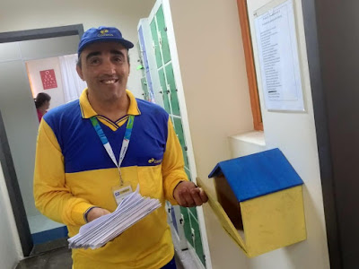 E, para fechar nossa edição com chave de ouro, hoje os estudantes dos 3º anos A e G, do Ensino Fundamental, conheceram o carteiro Sérgio Soares. Carteiro? Sim! Como parte do projeto “Cartas pelo Mundo” puderam conhecer mais sobre essa profissão. Bacana, não? Você não viu nada... Vem aí o selo dos 20 anos do Maru! Aguarde...